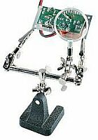 If you ever have seen those tiny SMD parts you will understand that it's almost impossible to solder them without the help of a magnifiyng glass although I have seen with my own eyes people doing this. They must have eyes like an eagle! As I didn't want to invest much money for my equipment I bought a 'helping hand' as shown here: