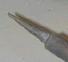 ![]() my 'helping hand' and a fine pointed soldering tip This 'helping hand' costs only about CHF15.- (~$10). Usually I have the small boards resting on the table and don't use the clips. Some people I know use a headset with an magnifying optic on it.